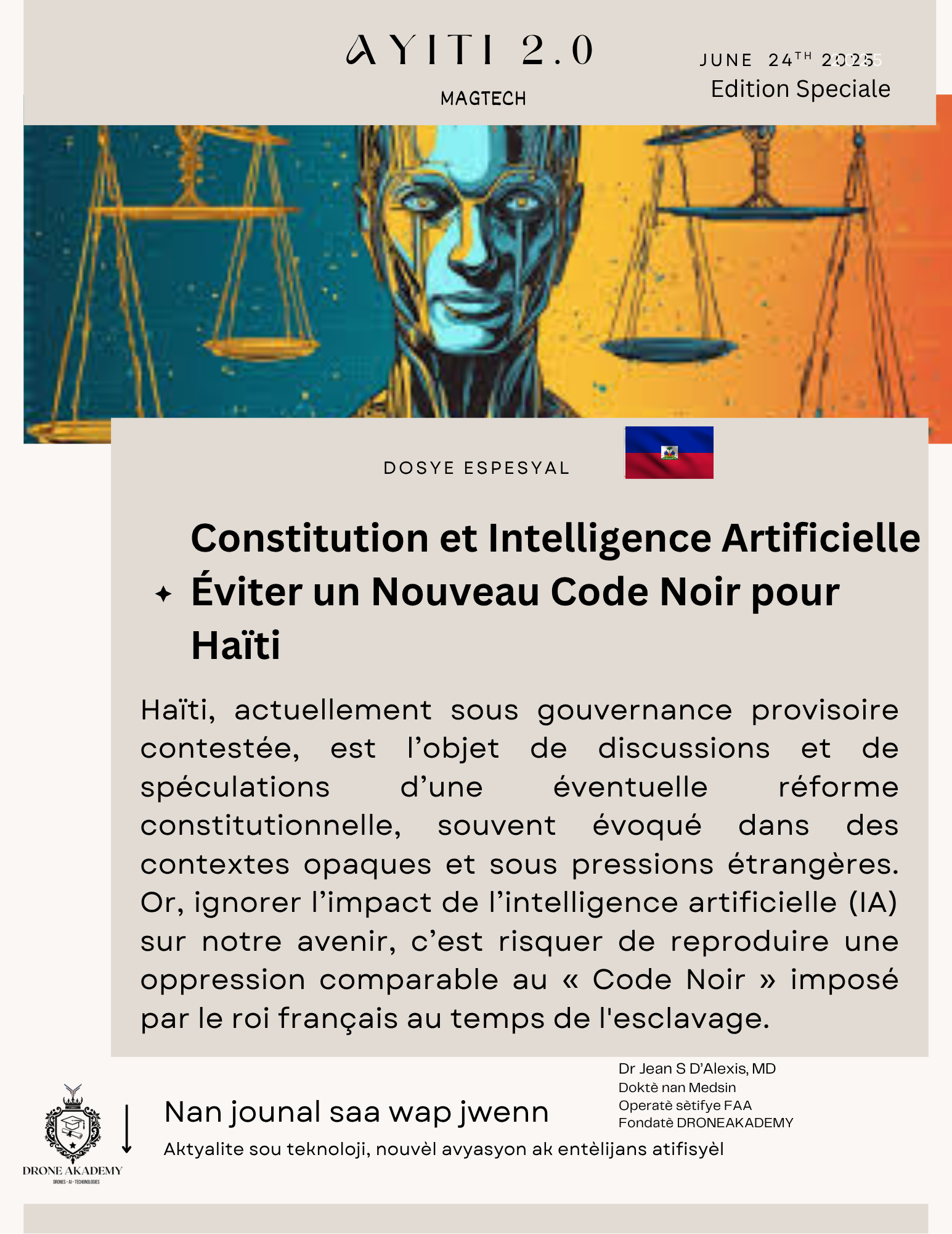 Cet article explore pourquoi l’intelligence artificielle doit impérativement être intégrée à la future constitution d’Haïti. Entre risques d’asservissement numérique, surveillance algorithmique et perte de souveraineté, il propose une réflexion visionnaire sur l’avenir d’un pays face aux technologies émergentes.